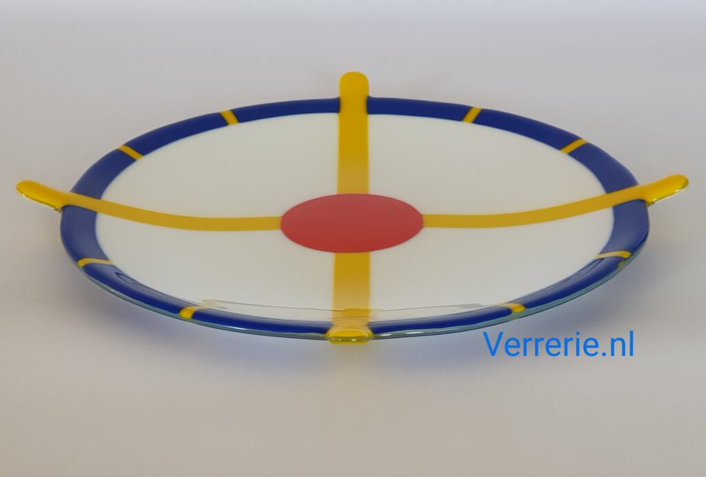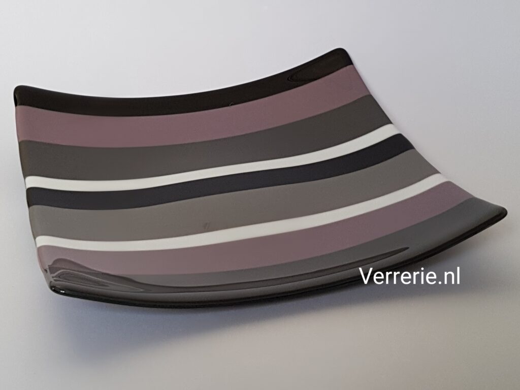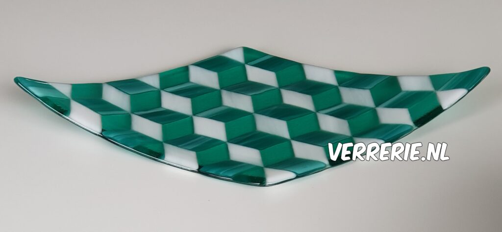 Glazen schaal van 2 lagen gefused System96 glas, ovaal 38 x 20 cm.Glazen schaal van 2 lagen gefused System96 glas, 30 x 30 cm. Bovenste laag bestaat uit stroken.Glazen schaal van 2 lagen gefused System96 glas, 30 x 30 cm. Glazen schaaltje van 2 lagen gefused System96 glas, diameter 9 cm.Glazen schaal van 2 lagen gefused System96 glas, 30 x 30 cm.Glazen schaal in 3D, 2 lagen gefused Oceanside glas, 23 x 40 cm, 70 (halve) ruitjes op een transparante onderplaat.Glazen schaal van 2 lagen gefused glas, 30 x 30 cm, mix van System96 en Wissmach.Glazen schaal in Mondriaan kleuren ter gelegenheid van 100 jaar Mondriaan en de Stijl in 2017. 2 lagen gefused System96 glas, diameter 30 cm.