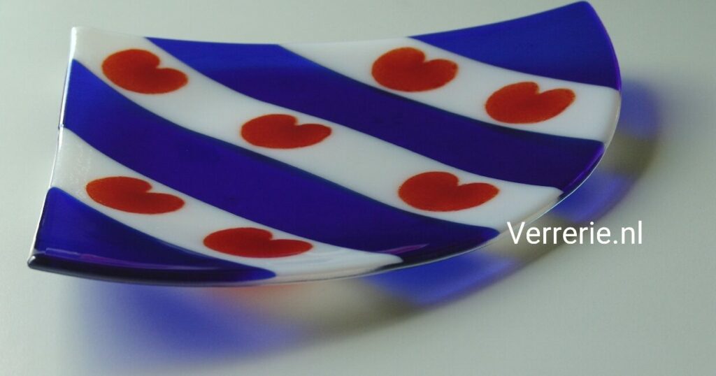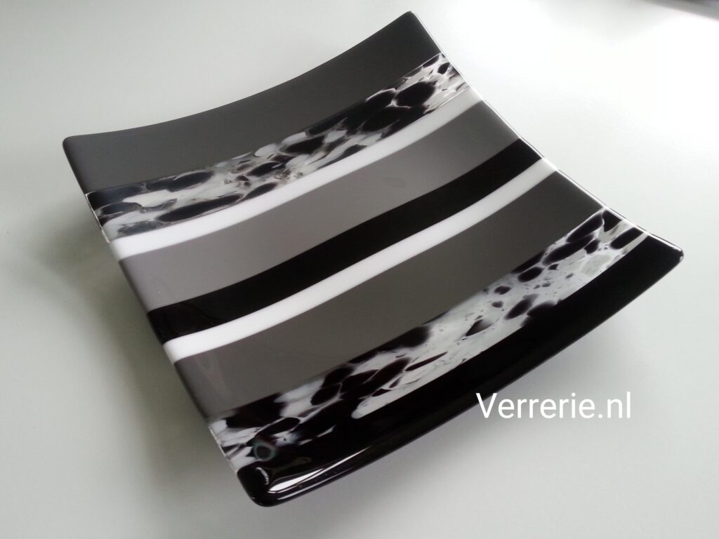 Glazen schaal van 2 lagen gefused System96 glas, 30 x 30 cm, met bijpassende onderzetters, 9 x 9 cm.Glazen schaal van 2 lagen gefused System96 glas met het wapen van een stad, 20 x 30 cm.Glazen schaal van 2 lagen gefused Artista glas.Glazen schaal van 2 lagen gefused Artista glas, 30 x 30 cm.Idem met bijpassende klok.